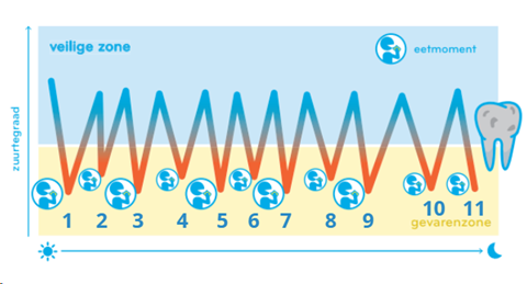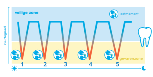 Je tanden worden elke keer “aangevallen” door zuur en suiker als je eet of drinkt (niet bij water/suikervrije thee of koffie). Je tanden worden dan gedemineraliseerd (het glazuur wordt zachter) en tussen de eetmomenten door hebben je tanden rust nodig om terug te herstellen (remineraliseren).