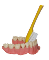 De haartjes van de tandenborstel moeten niet alleen tegen het tandvlees komen, maar liefst ook een beetje onder het tandvlees. Dat doe je door de tandenborstel te kantelen in de richting van het tandvlees onder een hoek van 45°.